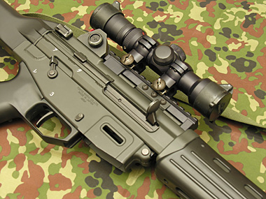マルイ純正のマウントベースより高さがあるので、スコープを取り付ける際にリアサイトをパスしやすい。 なお、搭載しているショートスコープはハッコーのTAC-2628というモデル。 |