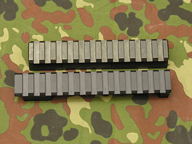 上方からの比較。左が実銃で右がマルイ製。最も気になるのはリアサイトのエレベーションおよび、ウィンデージダイヤルに数字が刻印されていないこと。また、目盛りにもホワイトが入っていない。ダイキャストによるモナカ構造のアッパーフレーム上部の合わせ目も気になる。が、全体の造型からいえば些細なこと。 しかしながら、パーツメーカーからのリアルリアサイトの発売を望む。