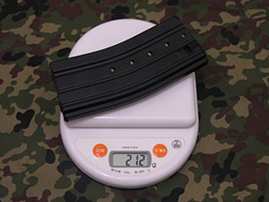 ![]() ノーマルマガジンは212g。420連マガジンも同程度の重量。 |