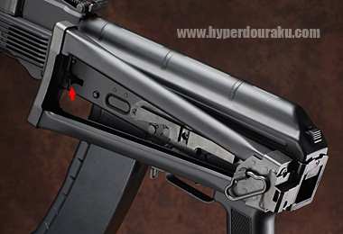 AKS74Uと同等のもの。がっしりと丈夫で構えやすい。矢印のボタンを押して左側面に折りたたむ。