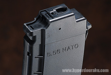 マガジンは6mmBB弾を480発装填可能なゼンマイ給弾の多段数マガジンが標準装備される。5.56mm×45の刻印が左側面にある。