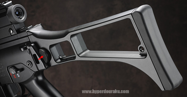 折りたたむときは矢印のストックロックボタンでリリースし、レシーバー右側面へとスイングさせる。