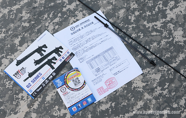 パッケージ内容。本体、マガジン、チャージャー、チャージングロッド、クリーニングロッド、取説、カタログ、弾速証明書が同梱される。