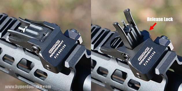 フロントサイトはフリップアップ式。サイトピンを回して上下の調節が可能。起こした状態ではロックが掛かり、不意に倒れない仕組み。側面のリリースボタンを押して折り畳む。