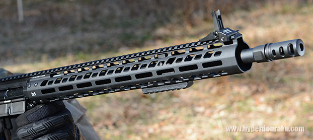 16インチバレルは細身のハンドガードで20インチくらいの長さに感じる。実測では14.5インチバレルのM4カービンよりフロントが8cmほど長い。しかし、ハンドガードは握りやすく、かなり軽量で長さを感じさせない取り回しが可能だ。