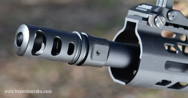 フラッシュハイダーはサイド3ポートコンプ。流行のスタイルだ。左側のイモネジで止まっていて、取り外せばM14逆ネジ仕様となっている。
