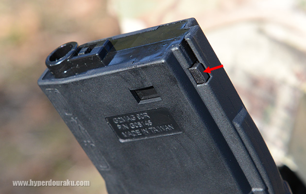 トレポンと異なり、マガジンを途中で抜けばチャンバーに弾残りすることがあるので、本体から確実にBB弾を取り除きたい心理が働く。その際、マガジンハウジングに指を突っ込んで小さなレバーを押しながら撃たねばならないのは面倒だし、安全面にも疑問が残る。機能をオミットしようと思っても自動停止機構と共有している部分なので、なんとも歯がゆいところ。
