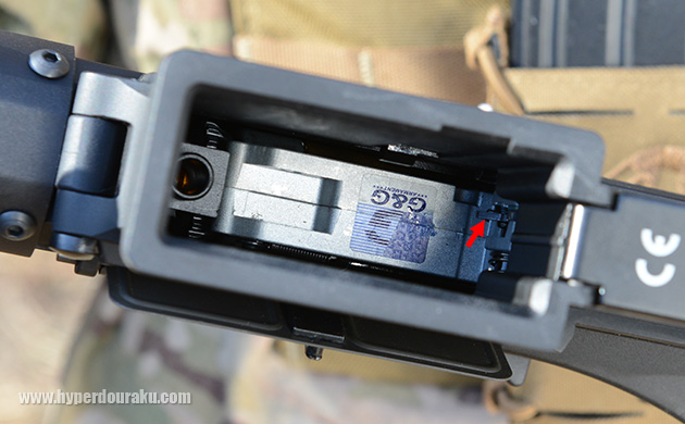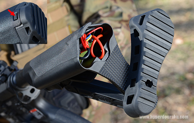 ストックチューブ内は電子基板とヒューズで実質バッテリーを収納することができない。両サイドに膨らんだストックのチーク部にバッテリーを収納するのだが、このスペースも幅19.5mmの純正バッテリーを一つ入れるのでギリギリ。三又の場合、左右の空間に2つのバッテリーを入れ、残りの1つは中央部に入れるのだが、完全にストックを最短にすることができず、3~6ポジションでの運用となる。