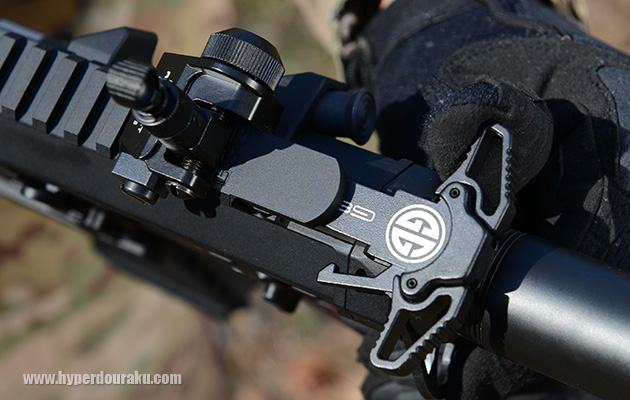 チャージングハンドルもアンビ仕様。写真の位置まで2.5cmほどのストローク。引くとG&Gのロゴが現れる。