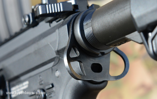 レシーバーエンドにはCQDタイプのスリングスイベルプレートあり。このプレートの穴からギアボックスが見える。放熱用なのか、埃や砂などが侵入しないかちょっと心配だ。