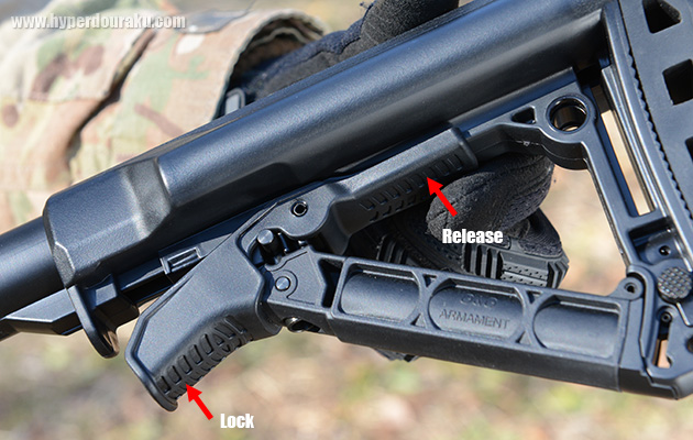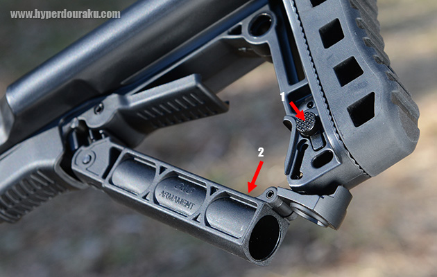 ストックリリースレバーのほか、ストックを固定するロックレバーも装備しており、ストックチューブにガッチリと固定できるのが嬉しい。