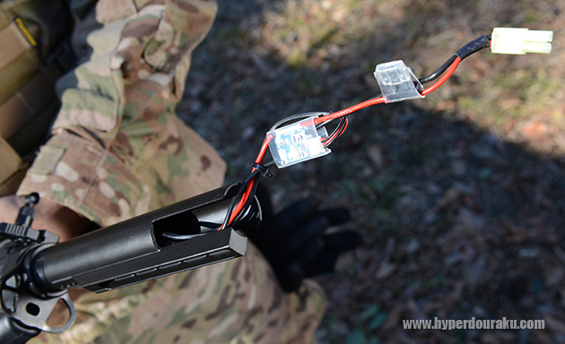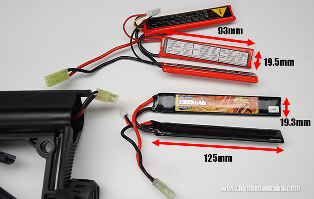 今回Option No.1の1300mAh 7.4V二又リポバッテリーも試したが、こちらの二股ならば長さ12.5cm×幅19.3mmでぴったりと収納でき、ストック最短にもできる。レスポンスを考えると断然11.1vを推すが、ストックを短く使いたい場合は2セルの二股バッテリーの選択となるだろう。