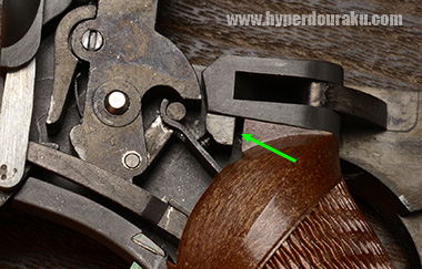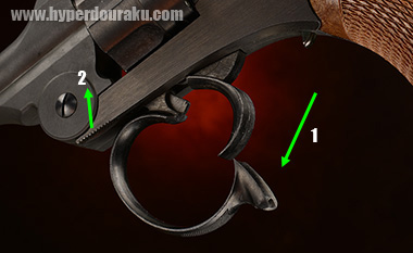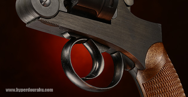二十六年式拳銃には実銃もそうだがシリンダーをロックするものがなく、通常時シリンダーはクルクルと右回転で回ってしまう。トリガーを引くとトリガー上部に設けられた爪がシリンダーをストップさせる仕組み。