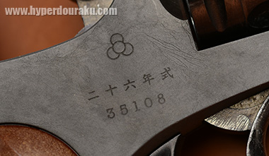 フレーム右側面には実銃の製造元である東京砲兵工廠の四つ輪マークが刻印される。二十六年式の刻印の下はシリアルナンバーだ。このシリアルナンバー、35108は海外に現存する実銃と同じナンバー。モデルガンのほうは50910でハートフォードがアメリカで所有する二十六年式のものだ。エアガンとモデルガンを明確に区別するためにこのような方法を取ったということだ。