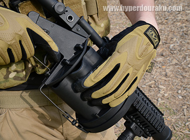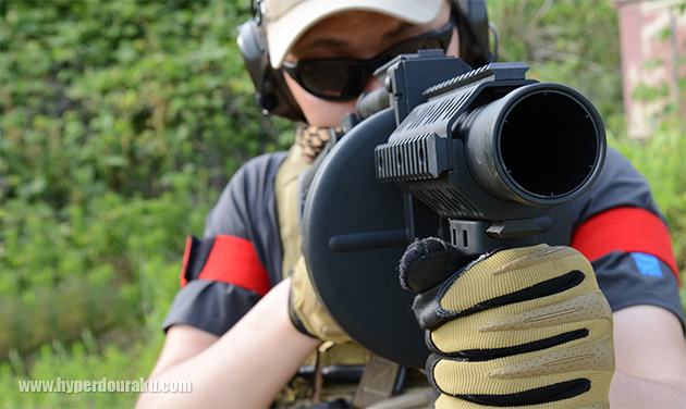 発射準備完了。40mm口径の太いバレルから100発のBB弾がガスの白煙とともに飛び出す。音も派手でバコムッ!!と大きな音を立てて敵にBB弾のシャワーを浴びせることができる。