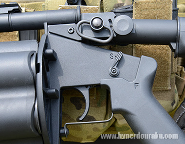 グリップ上には両側から操作できるアンビタイプのセフティがある。