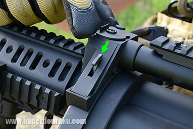 矢印のボタンを押してストックの角度を変更できる。仰角をつけて撃つグレネードランチャーならでは。