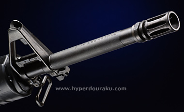 1回転7インチの太いヘビーバレルに変更されたのもM16A2の特徴。フロントアウターバレルは亜鉛ダイキャスト製で、上面には使用弾薬とライフリングを表す刻印がある。