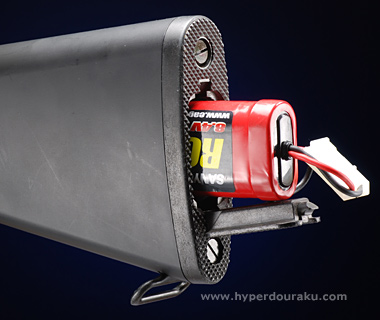 バットストック部は亜鉛ダイキャスト製で、コンパートメントキットの蓋を開けてバッテリーを挿入する。