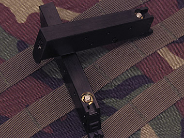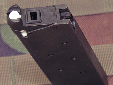 ブッシングレンチでマガジンフォロアーを引っかけて押し下げ、マガジンベースの突起に固定することで、簡単にBB弾をローディングすることができる。