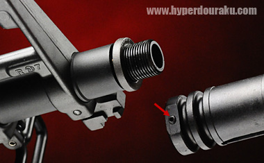 フラッシュハイダー下面のイモネジを緩めるとハイダーを取り外すことができる。