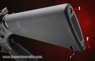 ストックはM4 PMCで使用されたHK416タイプのショート・フィクスドストック。従来のA2ストックよりも約9cmも短く、軽量で取り回しが良い。