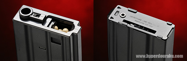 標準で300連のゼンマイ給弾式のマガジンが付属する。もはや電動ガンユーザーにとってはもっとも馴染み深いマガジンといっても良いかもしれない。上の蓋をスライドさせてBBボトルからジャラジャラとBB弾を入れ、マガジン底部のギアをジージーと回してゼンマイを巻く。