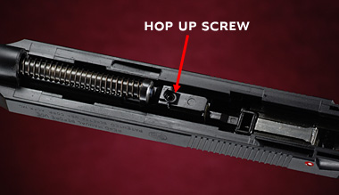 チャンバー下にホップアップ調節用のイモネジがある。調節には六角レンチが必要でやや面倒だ。撃っていると再び緩んでくることもあるそうなので注意が必要とマニュアルにもある。