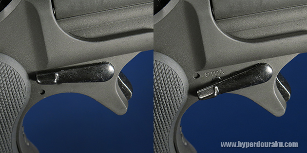 トリガーは金属製で、トリガーガードのないシンプルなものです。