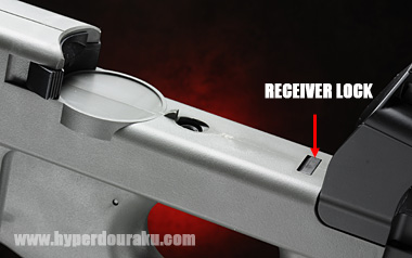 マガジンを引き抜くと矢印の位置にレシーバーロックボタンがある。