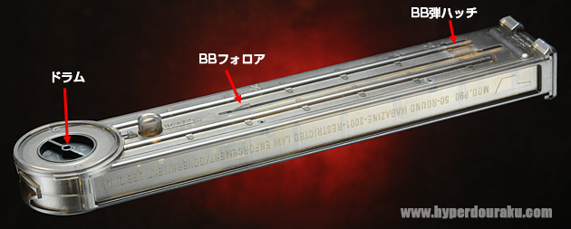 マガジンは6mmBB弾を300発装填できる。まずBBフォロアをBB弾ハッチの後ろまで引いてハッチを開けて固定する。ハッチからBB弾を流し込んでハッチを閉じたら、ドラムを回転させてゼンマイを巻き準備完了。