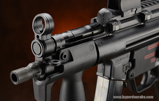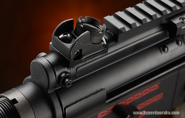 リアサイトはMP5シリーズでお馴染みのドラムタイプ。サイトラインが低いのでストックがあると狙いにくい。リアサイトベースは亜鉛ダイキャスト、ドラムはスチール製。