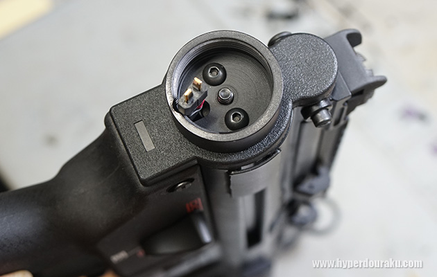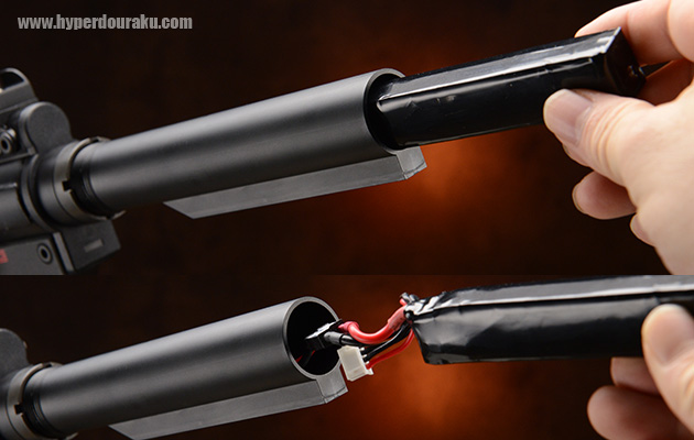 通常のMOVEコンプリートのMP5Kはレシーバー上部にバッテリーをセットするが、今回はストックチューブ内にリポバッテリーをセットできるよう加工してもらった。バッテリーはPTWのM4カービンと同じ11.1v 800mAhのリポバッテリーを使用する。バッテリーコネクタはミニT字。