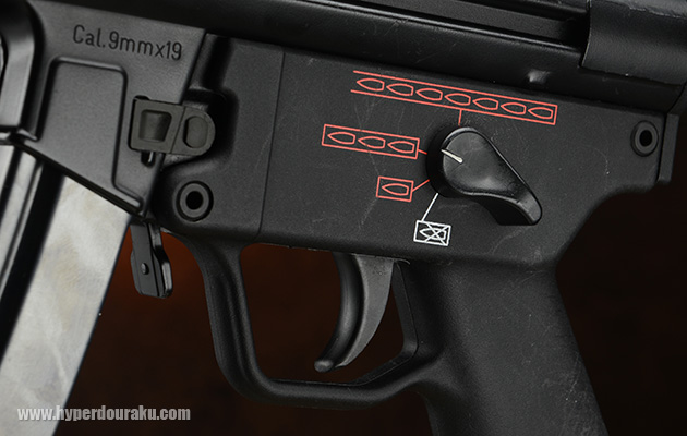 セレクターレバーは左右から操作できるアンビ式。3点バースト射撃も可能。