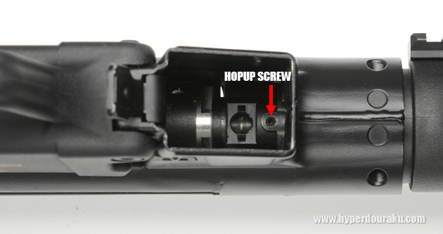 PTW共通のチャンバー底部の六角ネジで可変ホップアップを調整する。ハンドガードを取り外して調整するマルイのPDWよりは狂いもなく、面倒ではないが、マガジンを都度着脱する必要がある。