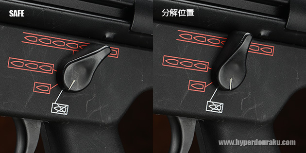 ちなみにセーフポジションからさらにセレクター回すと分解ポジションとなる。この状態だとレバーが取り外せる状態なので普段は回し過ぎに注意しよう。