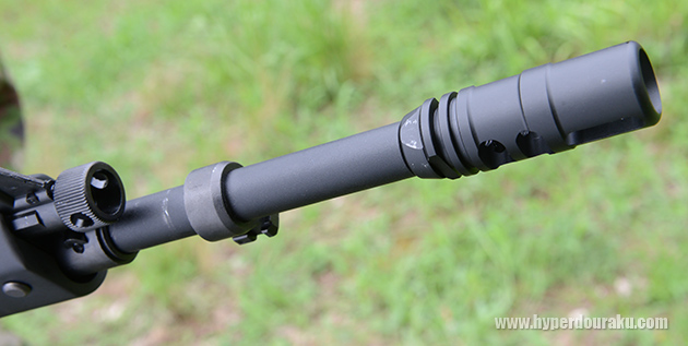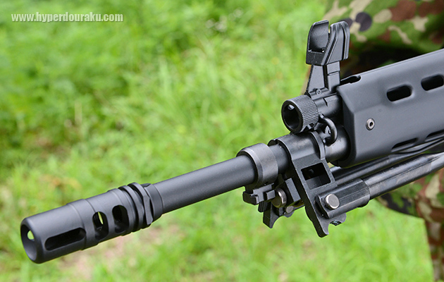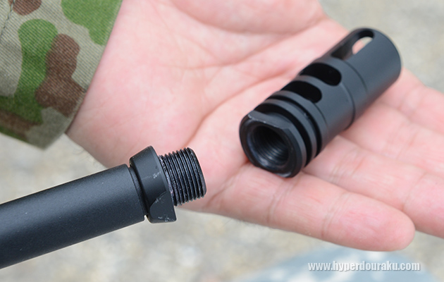 そうするとフラッシュハイダーが取り外せる。ネジ規格はM14逆ネジ仕様。