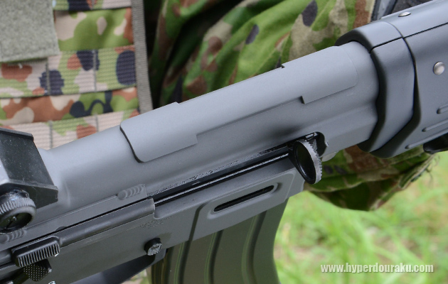 固定式のストック。バットプレートはラバー素材で、89式小銃の電動ガンでは固定されていなかったが、携行時に衣服に引っかかって外れやすいということからガスガンでは固定された。