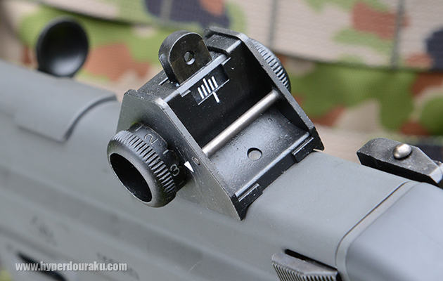 リアサイトは左右のダイヤルで上下左右の調整が可能。上下は左のダイヤルで調節し、100mから500mまで50m間隔で9段階あるが、450と500では高さが変わっている感じがしなかった。