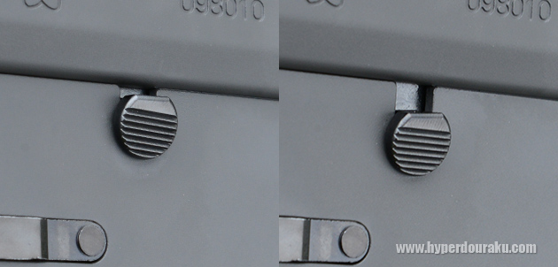 左面にはイラク派遣から支給され始めた左面セレクターが標準装備される。バネピンで留められる構造もリアルに再現。実際に自衛官が行ってる脱落防止のゴムチューブを取り付けてみたい。