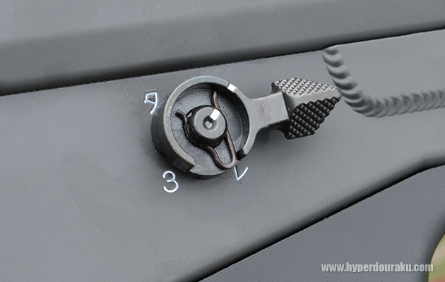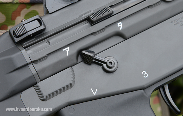 セレクターは独自の回転型で、ア(安全)位置から → レ(連発) → 3(三点射) → タ(単発)の順に回す。安全位置からいきなり単発に移動することはできない。セレクターの感触は電動ガンよりも軽く、各位置へのクリック感も明確。親指や人差し指でサクサク操作できる。