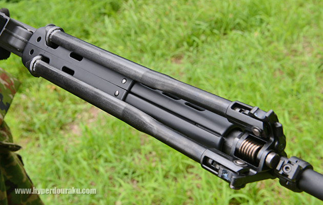 バイポッドを折りたたんだ状態。スパイクがハンドガード下の穴に収まる。