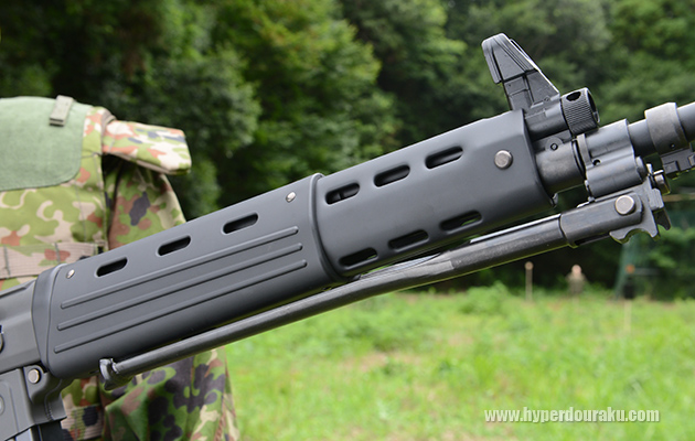 バイポッドを立ててプローン射撃。専守防衛の自衛隊伝統の射撃スタイル。またバイポッドは取り外すこともできる。