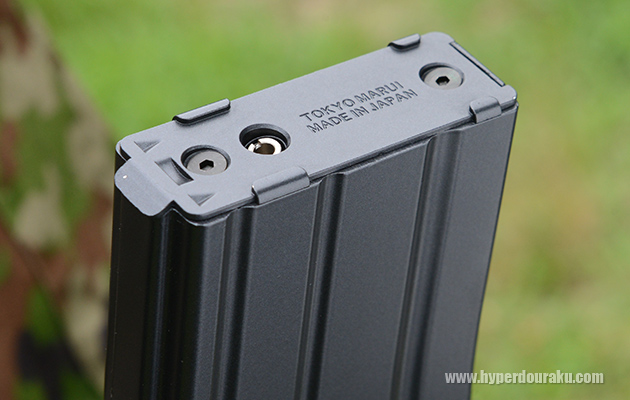 マガジンボトム。なお、マルイのM4カービン系ガスブローバックのマガジンと互換性がある。いわゆる実銃で言うところのSTANAG規格との互換形状だ。マガジン重量は実測で約470g。