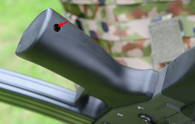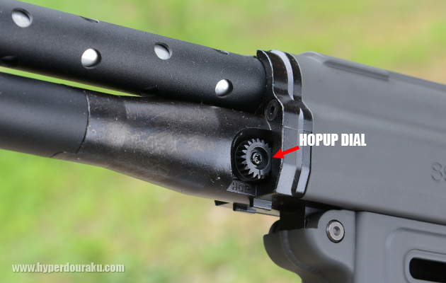アウターバレル基部の左側に可変ホップアップダイヤルがある。ダイヤルはクリック感がないタイプで、かなり固めに設定されているのでリコイルで狂ってしまうようなことはないだろう。このダイヤルは120度しか回転せず、0.25g弾が上限だと感じた。