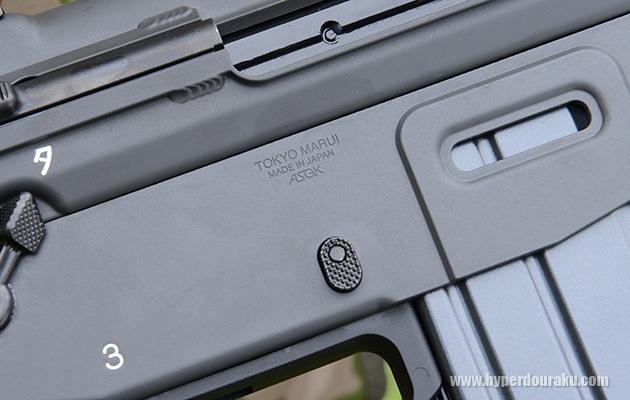 レシーバー右側にあるマガジンキャッチボタン。実銃の設計上の問題だが、小さくて押しにくいのと、ガードリブがないので不意に押されてしまわないように注意。ボタンの上には東京マルイの刻印がある。電動ガンより浅く小さめの刻印で控えめ。