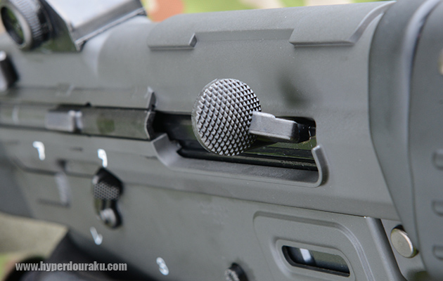コッキングノブはボルトに固定されており、射撃時には前後に激しく動く。