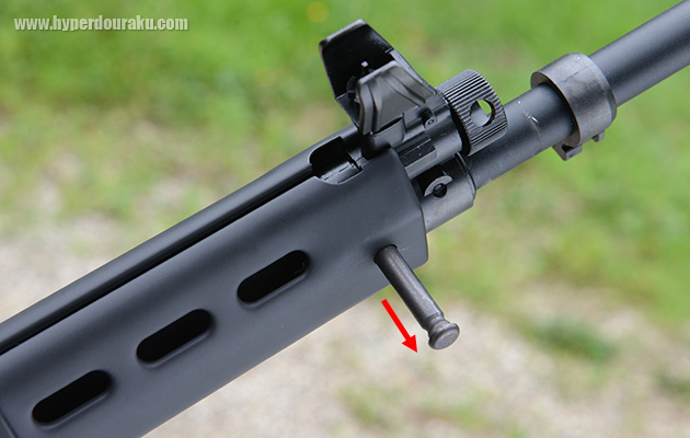 ハンドガードの取り外しはまず、フロント部のロックピンを抜く。ピンはハンドガード左に留まり紛失しない設計。