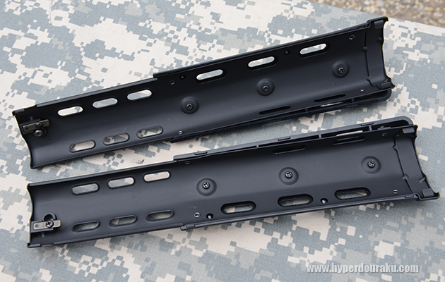 なお、このハンドガードを電動ガンに取り付けられるか試してみたが、アウターバレル中ほどの突起が干渉してそのままでは取り付けは出来なかった。逆に電動ガンのハンドガードはガスガンに取り付け可能だ。