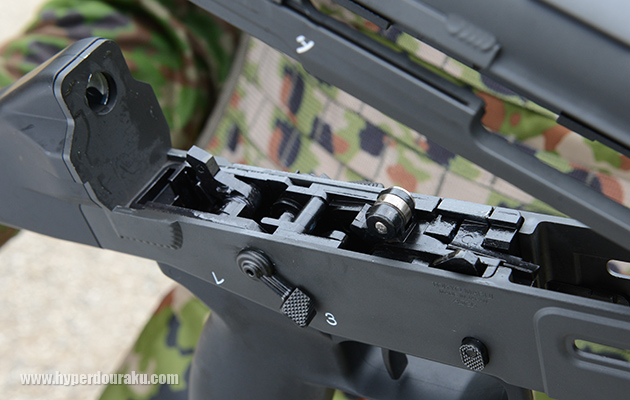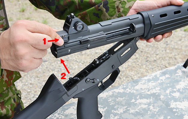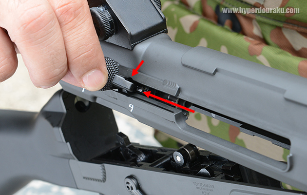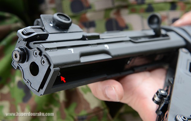 実銃同様にテイクダウンできる。矢印の部分がテイクダウンラッチ。